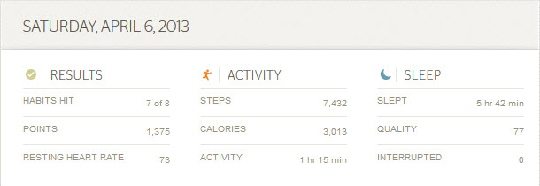 Posted on 2013-04-07 (Sunday) by juice 2012-04-06 (Saturday) No gym – quads insanely sore. Went to a HMP demo, so walked/stood a fair bit in the late morning/early arvo. Warmer day, back over 3k burn. Rate this:Share this:Tweet Click to share on WhatsApp (Opens in new window) WhatsApp Like Loading...
