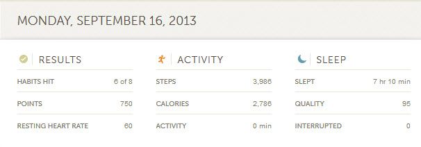 Posted on 2013-09-17 (Tuesday) by juice 2013-09-16 (Monday) Tough Mudder recovery. As to how busted I was, I managed to get in 1000 steps in all thee time periods, but still showed a massive ZERO minutes active, so although I was getting around, it was just barely 🙂 Rate this:Share this:Tweet Click to share on WhatsApp (Opens in new window) WhatsApp Like Loading...