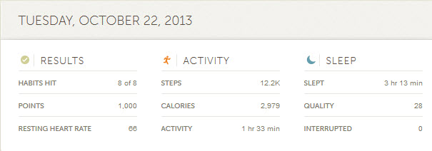 Posted on 2013-10-23 (Wednesday) by juice 2013-10-22 (Tuesday) Rain again. Got a decent walk in earlyish (after finally waking up…) Hate falling just short of the 3K calorie level 😦 Rate this:Share this:Tweet Click to share on WhatsApp (Opens in new window) WhatsApp Like Loading...